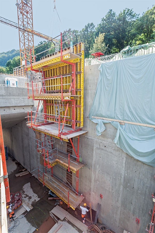 • VARIO GT 24 ahşap kirişli perde kalıbı ile kurulan SCS tırmanır kalıp sistemi tek bir parça halinde vinç ile taşınabilir. (standart kullanım)